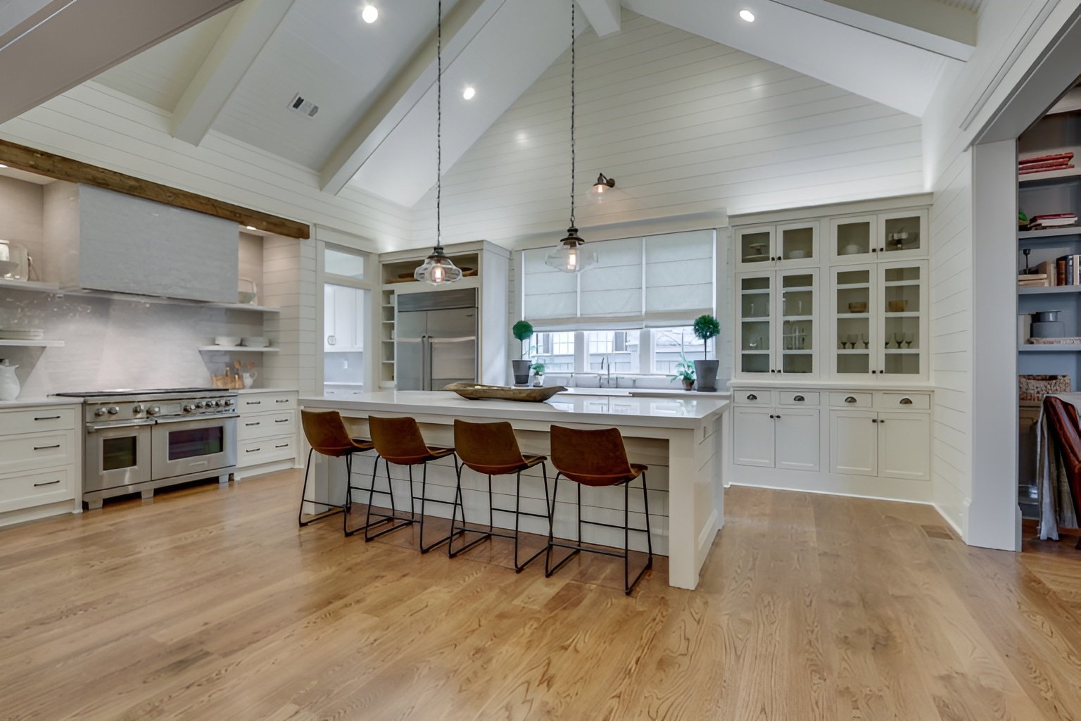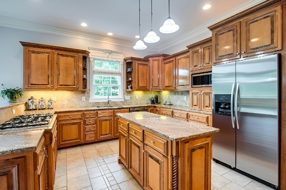 Warmer cabinets make this kitchen a very welcoming space. Available at 1115 Wilson Pike, the kitchen opens to the breakfast area with stunning views of the gorgeous 4.7 acre property which includes a charming pond!