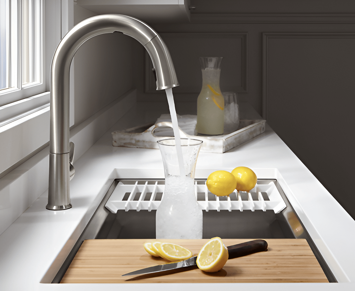 There are little elements which help weave together an amazing kitchen. Kohler has a touch faucet so you don’t have to engage the knob, just touch and go.
