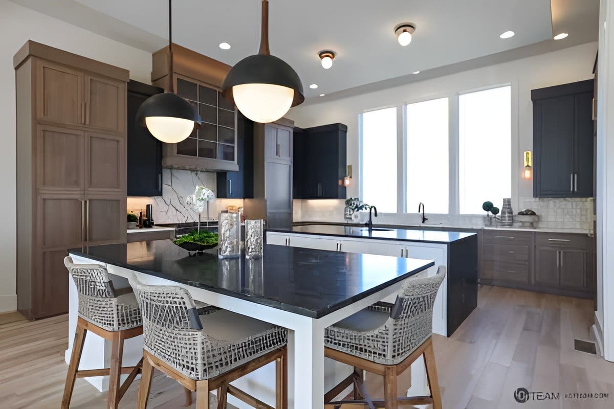 One element that can work well is placing the kitchen sink underneath a window and a great view is a bonus. Wrapping the sink wall with tile is also a great look. Keep the island, sink free, and it can be helpful if you like casual dinners at the island. It also allows more space to be used as a buffet.