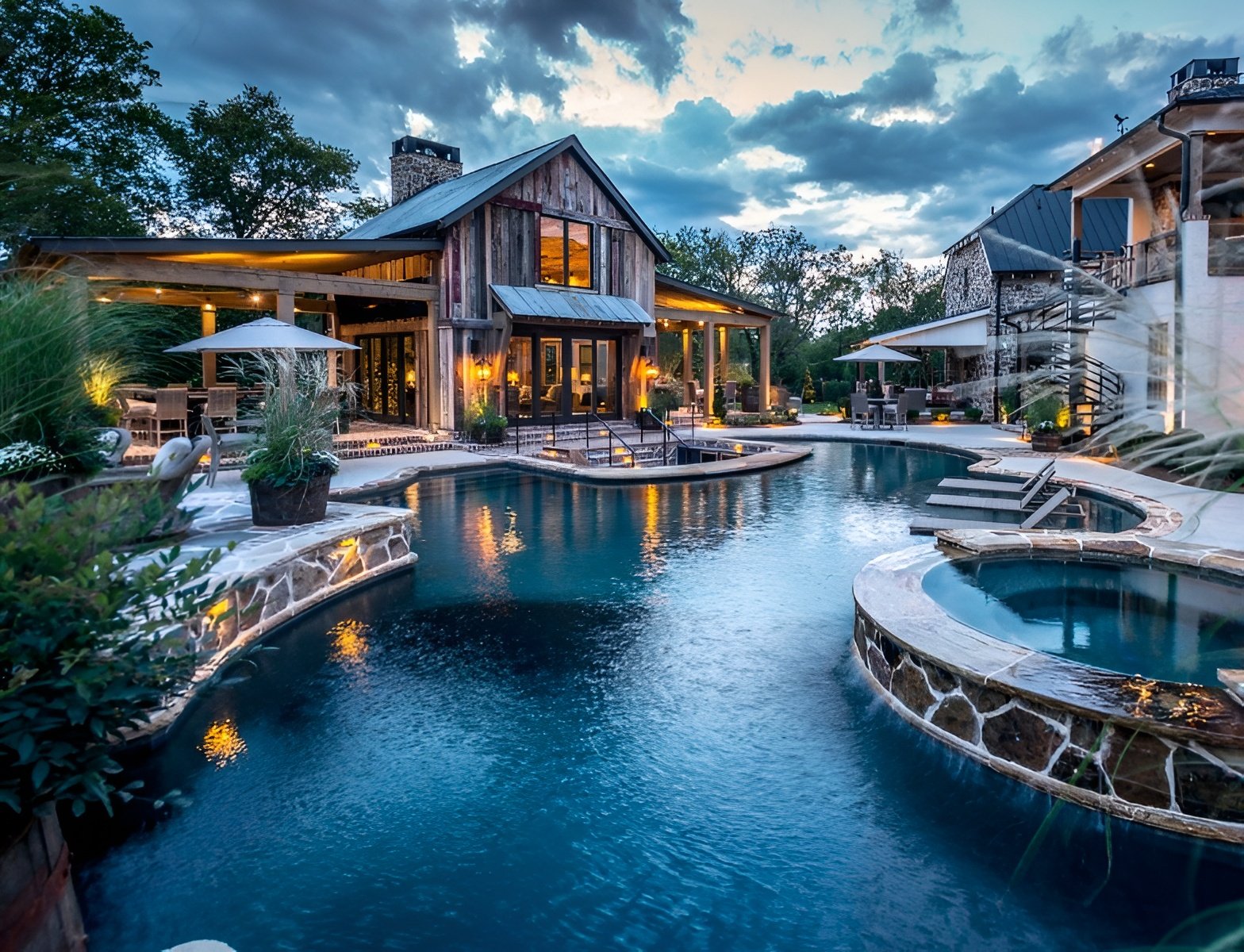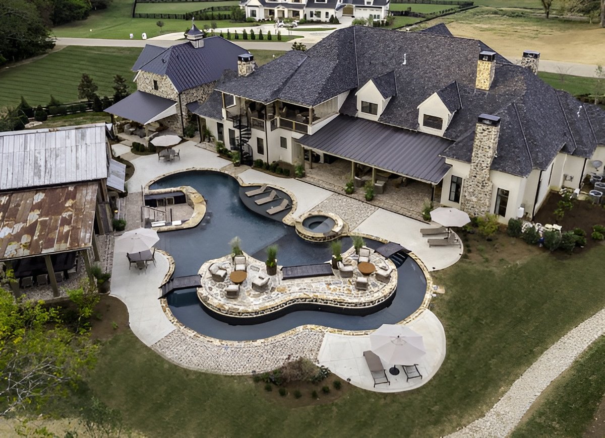 This Trace Construction home, listed and sold by the LCT Team – Parks REALTOR® Lisa Culp Taylor, included a swim up bar, lazy river and a pretty barn pool house. (Photo by Reed Brown)