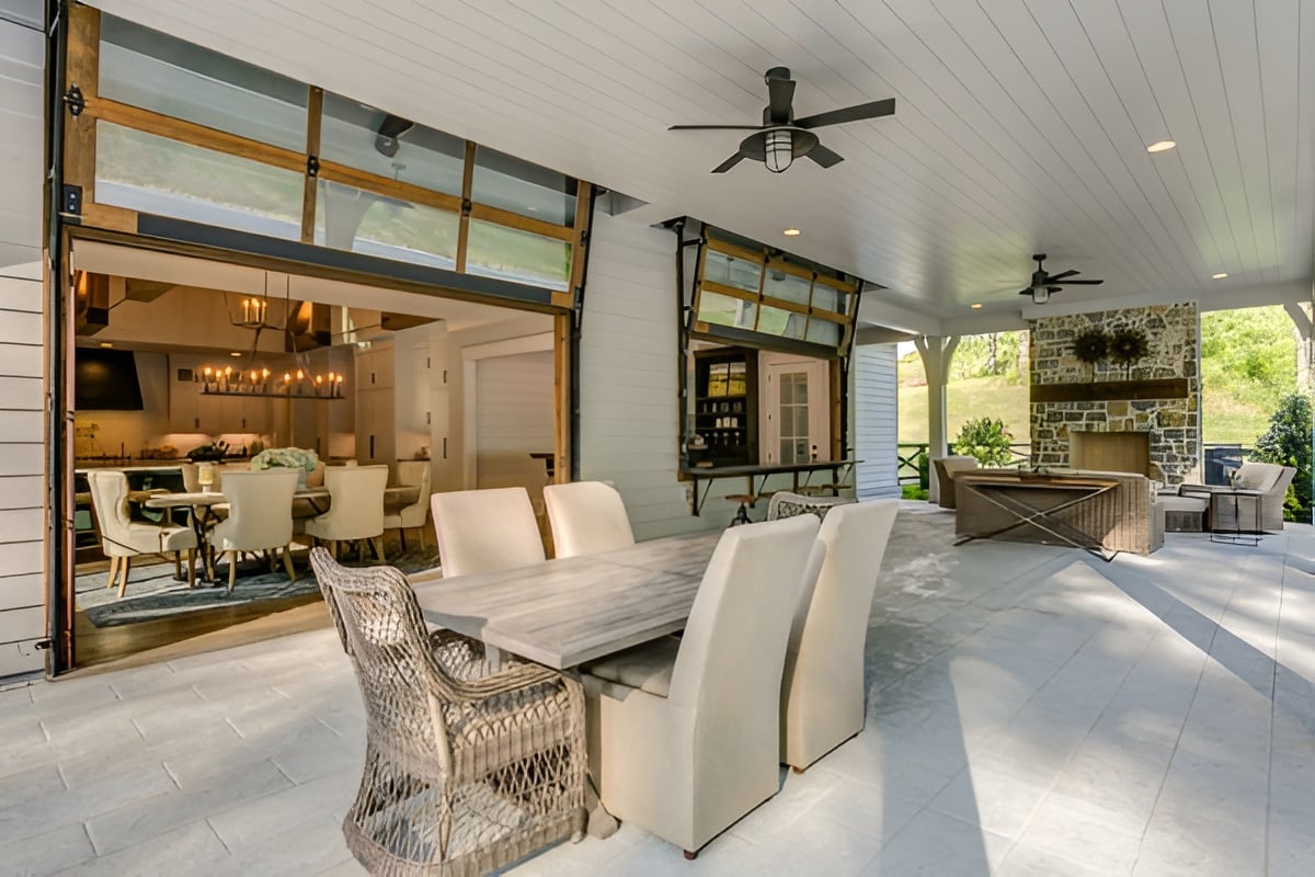 This beautiful Trace Construction covered porch uses clear, garage doors weaving the outdoors with the home’s interiors!