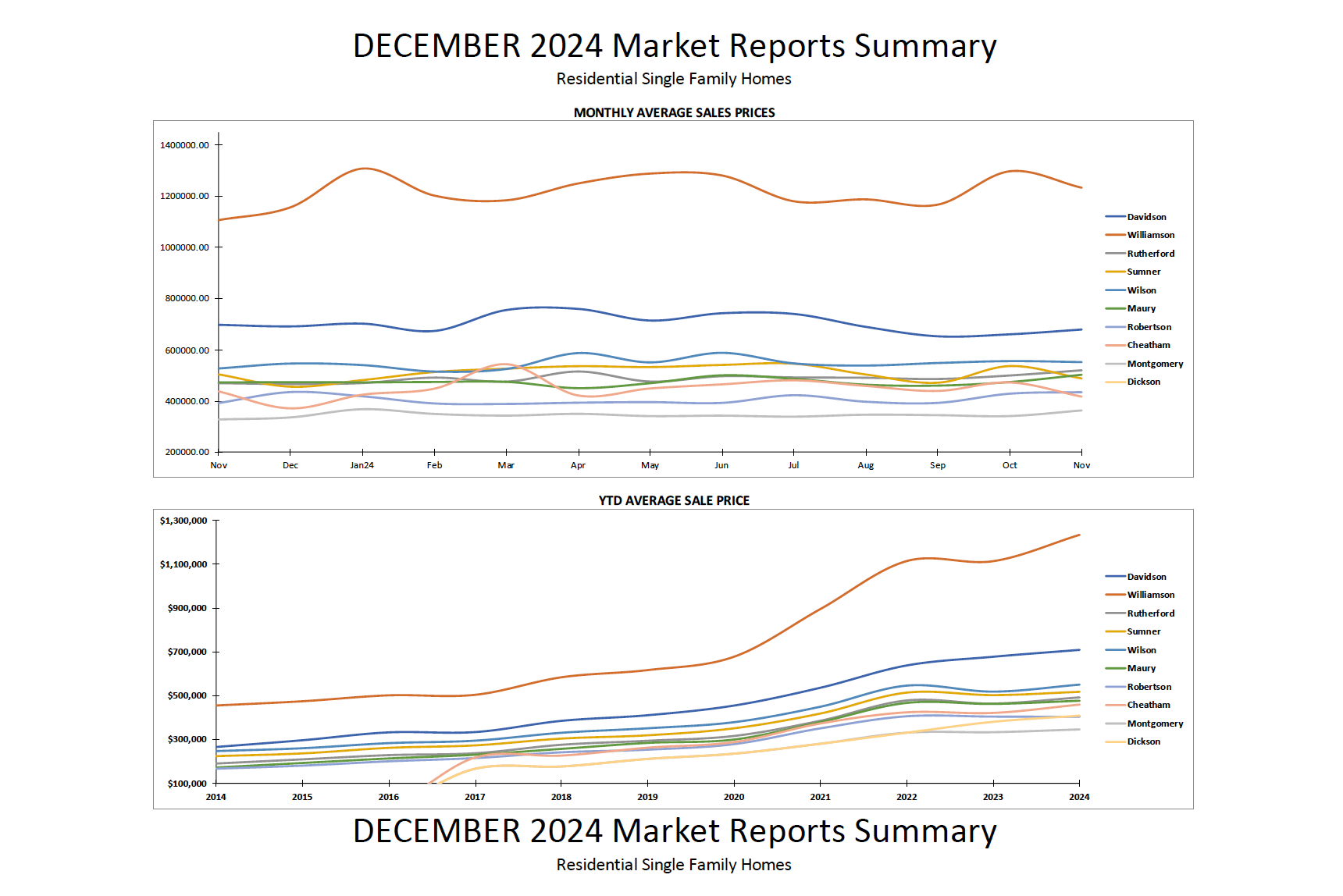 December sales prices outperformed last year in all counties except Davidson, Montgomery, and Robertson. However, on a YTD basis, every county reported higher sales prices compared to 2023. Williamson County led the way with an impressive 9.5% increase, while Robertson County saw a modest rise of 0.1%.