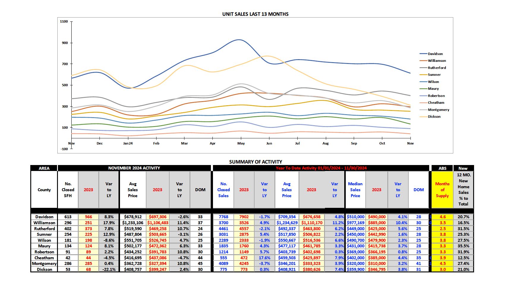 Unit sales in December 2024 were higher than the previous year in most counties. Looking at the full year, Davidson, Dickson, Montgomery, Rutherford, and Wilson counties experienced slightly lower unit sales compared to 2023.