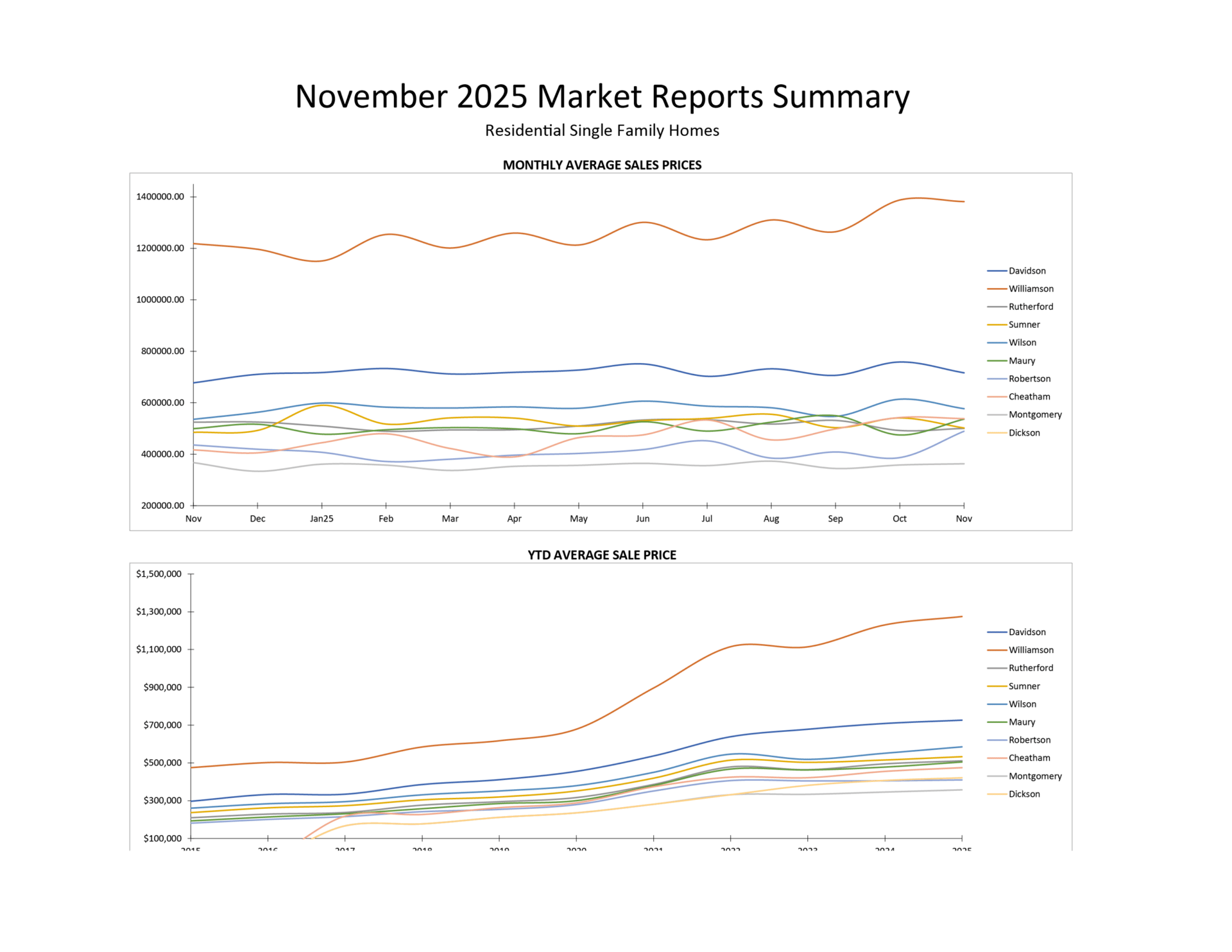 As we move toward the close of 2025, November’s residential single-family home data offers a clear picture of a market that is stabilizing, selective, and increasingly strategic. Across Middle Tennessee, activity softened seasonally, but pricing remains resilient in many core counties — especially in desirable, well-located communities.