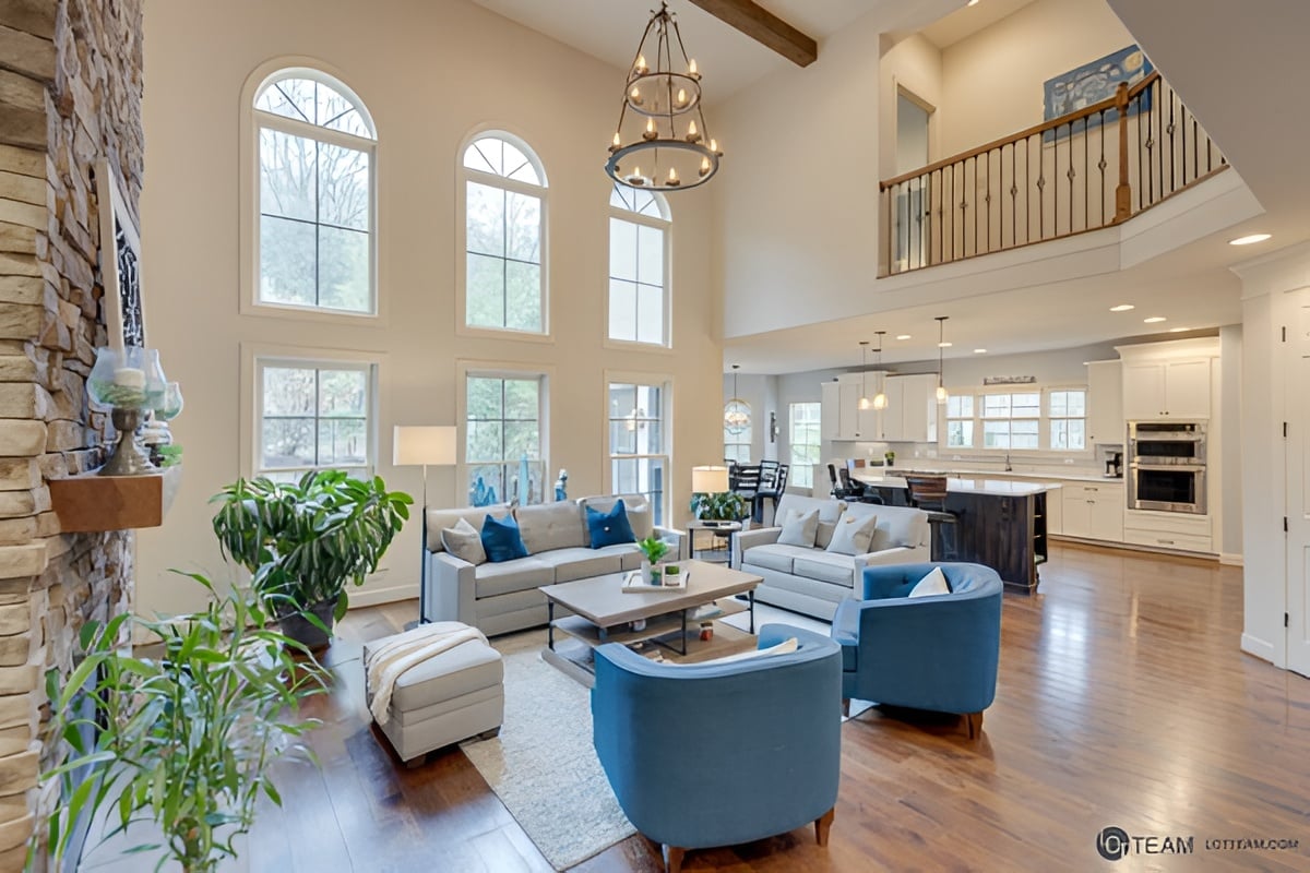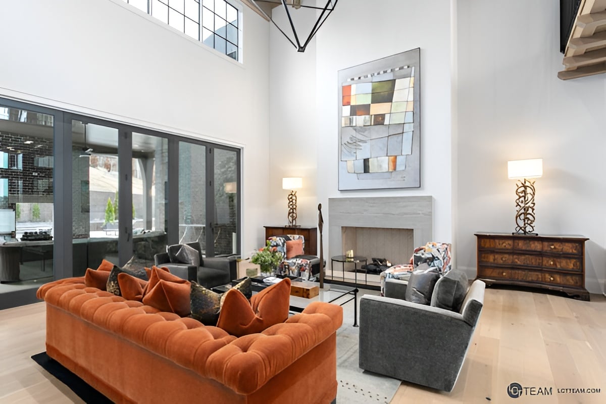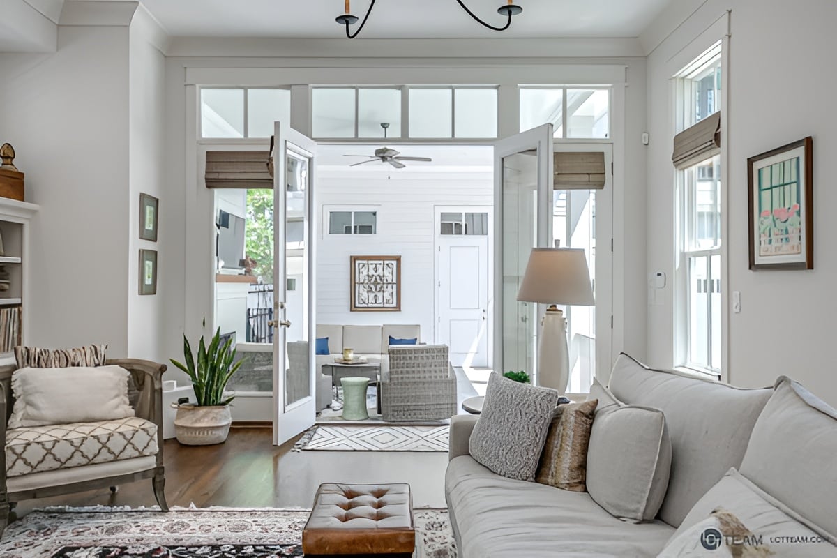 Instead of a large sectional sofa which can interrupt the flow of a room, flank a fireplace with two comfortable love seats or a sofa and two chairs to lighten up the room. If your living room opens to a covered porch, you’ll also want to be sure there is a clear path and it will help you double your entertaining space like these homes.