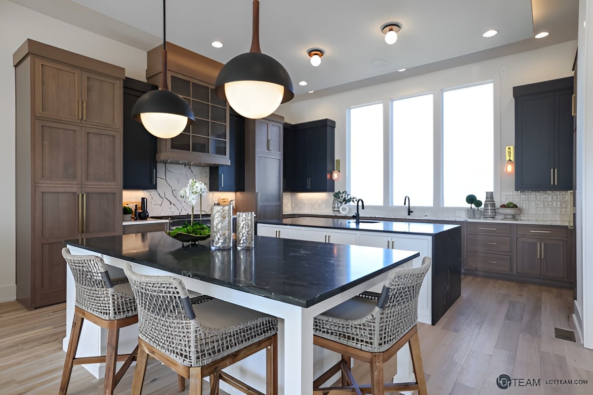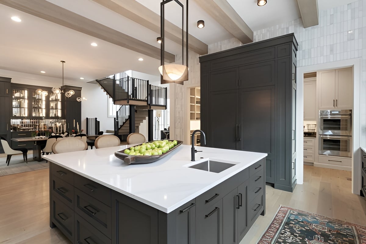 It can be a challenge to keep the kitchen clutter free when hosting. A great option is two islands which helps separate entertaining space from workspace like this stunning home available in Franklin.