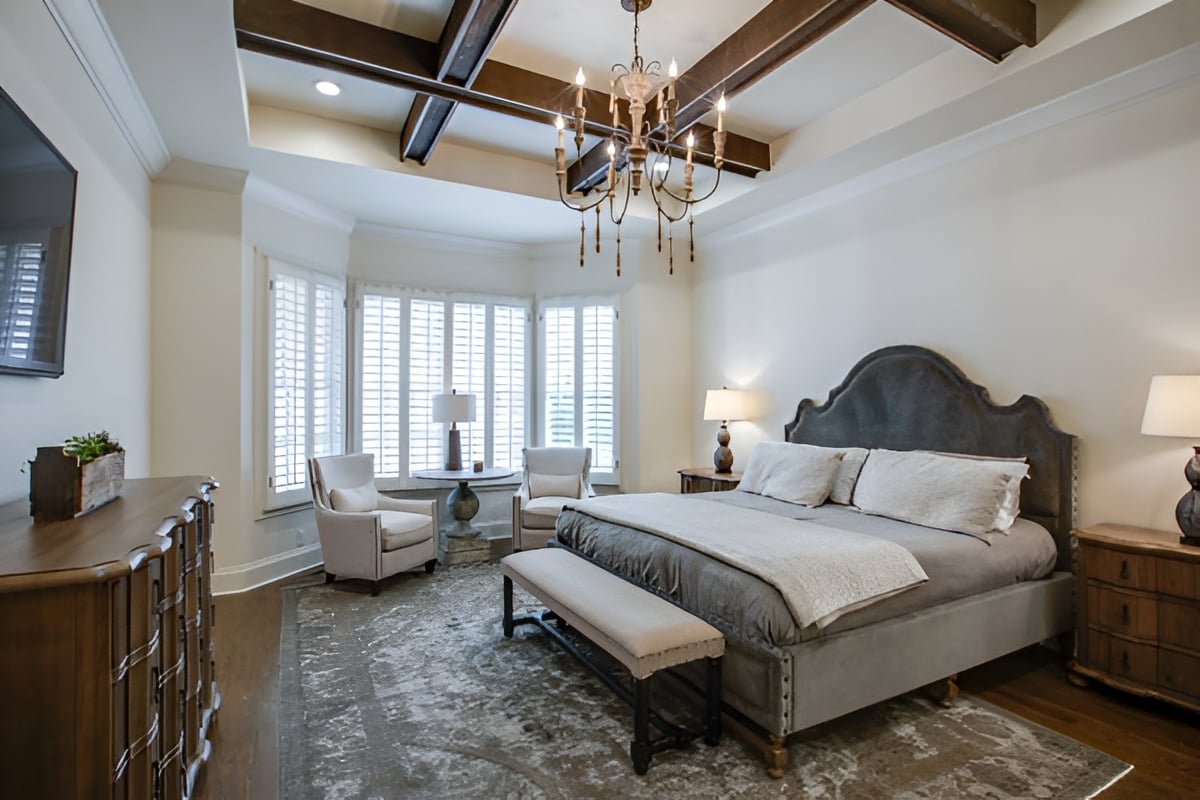 Located off the beaten path, the master retreat is on the main level with beautiful warm, exposed beams and a bay window sitting area.